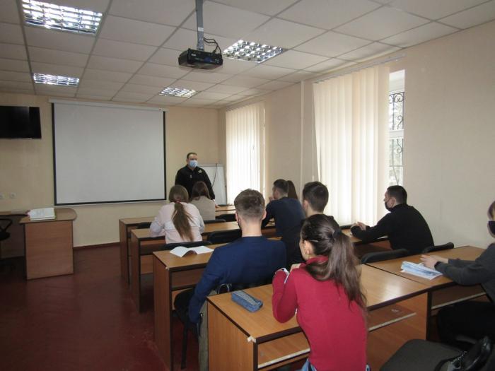 У межах вивчення дисципліни «Іноземна мова» для здобувачів вищої освіти 2 курсу доцентом кафедри гуманітарних дисциплін Юлією Самойловою та старшим викладачем кафедри Зоряною Мохоньок було організовано бінарне заняття спільно з начальником відділу ювенальної превенції ГУНП в Сумській області підполковником поліції Сергієм Тарасенком.