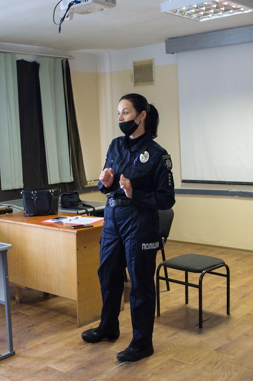 Капітан поліції Юлія Ходькова має великий професійний досвід роботи в поліції, п’ятнадцять років працювала в слідчих підрозділах, займала посаду старшого слідчого Шосткинського відділу поліції ГУНП в Сумський області. Вона розповіла курсантам про особливості кваліфікації і розслідування кримінальних правопорушень проти громадської безпеки, звернула увагу на найбільш розповсюджені правопорушенні у слідчій практиці працівників поліції, детально зупинилася на складностях, що виникають при розслідуванні кримінальних справ. Курсанти ставили багато запитань щодо розслідування різних видів кримінальних правопорушень і особливостей проходження служби в поліції. Юлія Ходькова докладно відповідала на всі запитання та привела у приклад власний досвід розслідування кримінальних справ різних категорій. Розмова виявилася предметною і мотивуючою, курсанти змогли вдосконалити свої знання з кваліфікації та розслідування кримінальних правопорушень працівниками поліції.