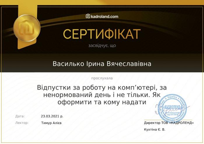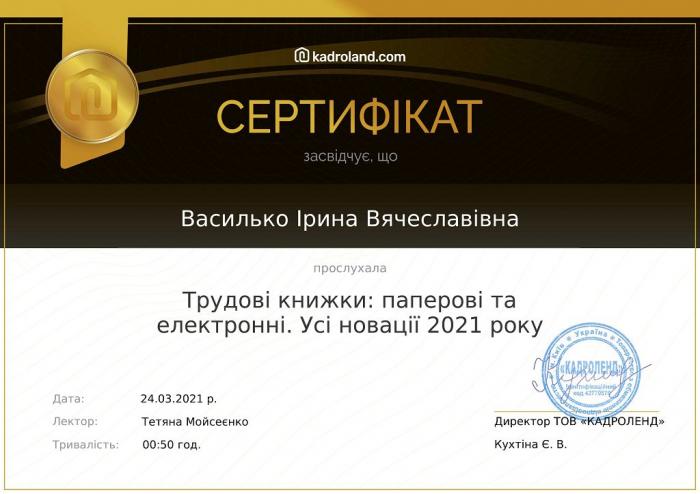 Доцентка кафедри правового забезпечення господарської діяльності факультету № 6 Ірина Василько прослухала онлайн серію майстер-класів на тему «Зміни в КЗпП: е-трудові, електронне ознайомлення та дещо про щорічні відпустки» та отримала відповідні сертифікати.
