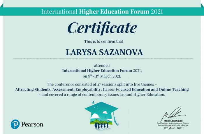 Старші викладачки кафедри іноземних мов факультету № 1 Любов Русанова та Лариса Сазанова відвідали триденний Міжнародний форум вищої освіти 2021 «International Higher Education Forum 2021», організований університетами Великобританії, міжнародною освітньою компанією Пірсон та її партнером – освітньо-методичним центром Дінтернал Ед'юкейшн.