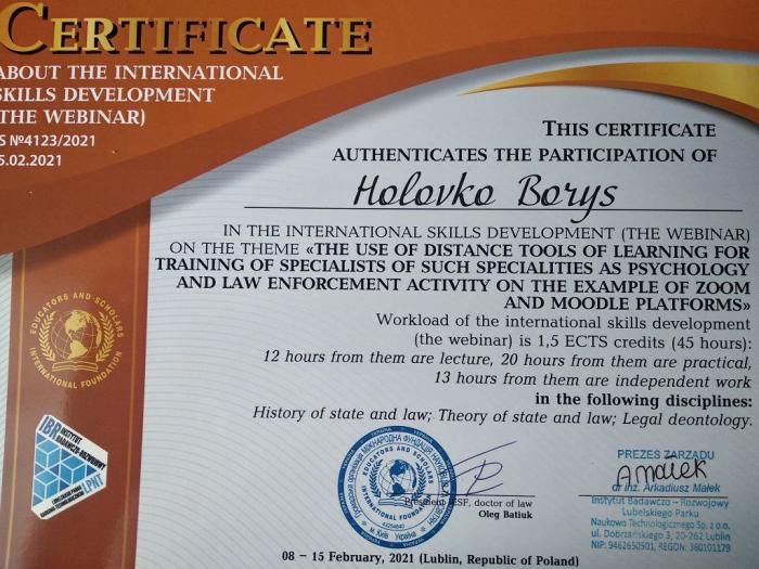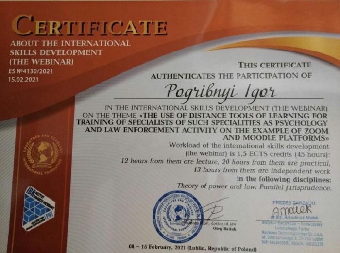 Науково-педагогічні працівники кафедри фундаментальних та юридичних дисциплін факультету № 6 продовжують підвищувати свій кваліфікаційний рівень через міжнародне стажування. Професор кафедри Ігор Погрібний, доценти Борис Головко та Юлія Перерва взяли участь у Міжнародному підвищенні кваліфікації (вебінар) наукових, науково-педагогічних працівників ЗВО та працівників закладів освіти на тему «Використання дистанційних засобів навчання для підготовки фахівців спеціальностей психологія та правоохоронна діяльність на прикладі платформ Zoom та Moodle», яке проходило у місті Люблін, Республіка Польща.