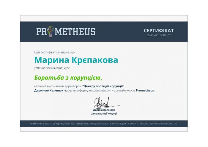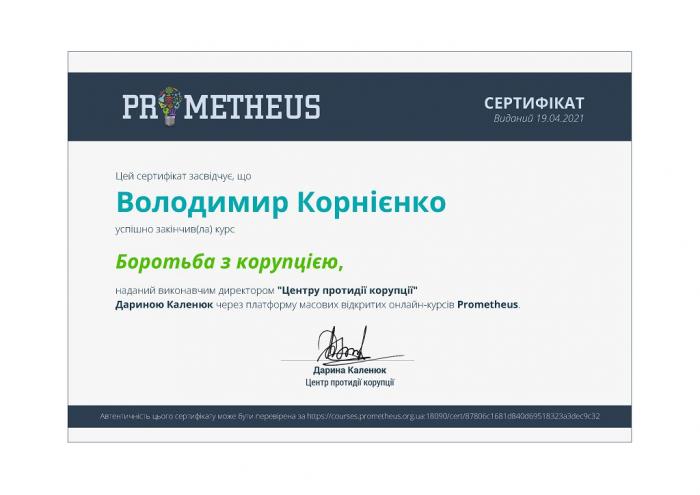 Науково-педагогічний склад кафедри поліцейської діяльності та публічного адміністрування факультету № 3 пройшов онлайн-курс «Боротьба з корупцією» через платформу масових відкритих онлайн-курсів Prometheus. Онлайн курс розроблено та створено Центром Протидії Корупції для міждисциплінарного науково-дослідного центру Anti-Corruption Research and Education Centre при Києво-Могилянській академії та для платформи масових відкритих онлайн-курсів «Prometheus» за фінансової підтримки Фонду «Відродження», Відділу преси, освіти та культури Посольства США в Україні та USAID | проекту Pact Uniter.