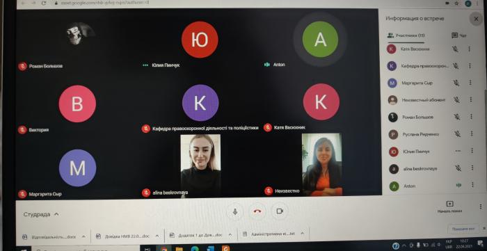 Відбулося онлайн-засідання кафедри правоохоронної діяльності та поліціїстики факультету № 6. Під керівництвом завідувачки кафедри, кандидата юридичних наук, професора Ірини Панової представники студентського самоврядування взяли участь в обговоренні питань щодо освітньо-професійних програм першого рівня вищої освіти «Правоохоронна діяльність». У засіданні взяли участь студенти: Аліна Бескровна, Ганна Більцевич, Роман Большов, Катерина Васюхник, Анастасія Дрьомова, Руслана Рідченко.