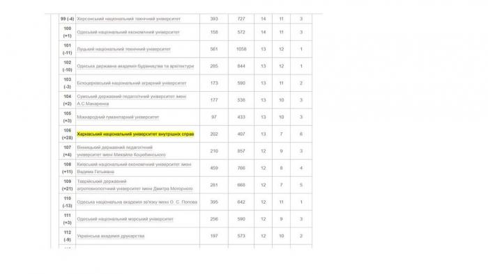 Харківський національний університет внутрішніх справ у порівнянні з минулим роком значно покращив свої позиції, піднявшись ще на 28 сходинок. Наразі він посідає 106 місце серед 190 ЗВО України з кількістю публікацій – 202, кількістю цитувань – 407 та індексом Гірша – 13. Також ХНУВС залишається беззаперечним лідером серед ЗВО зі специфічними умовами навчання, які здійснюють підготовку поліцейських: