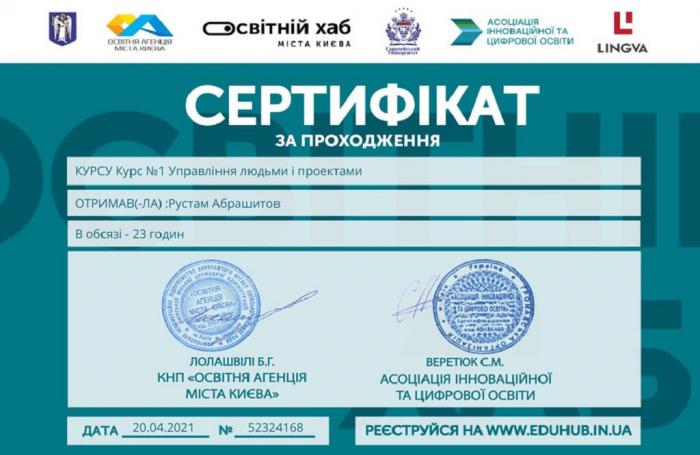 Начальник відділу міжнародних зв'язків та міжвузівської роботи Кременчуцького льотного коледжу Харківського національного університету внутрішніх справ Рустам Абрашитов пройшов онлайн-курс підвищення кваліфікації «Управління людьми і проєктами» та отримав сертифікат.