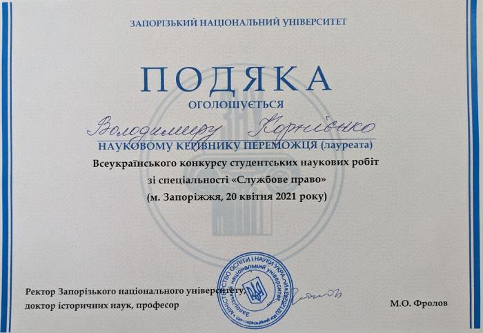 Подякою відзначено його наукового керівника – доцента кафедри поліцейської діяльності та публічного адміністрування факультету № 3, кандидата юридичних наук, старшого наукового співробітника Володимира Корнієнка.