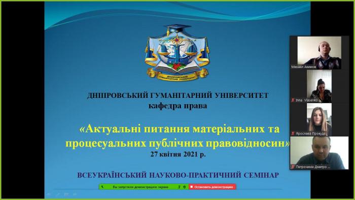 Доцент кафедри трудового та господарського права факультету № 2 Харківського національного університету внутрішніх справ, кандидат юридичних наук, старший науковий співробітник, підполковник поліції Валентина Гончарук взяла участь у всеукраїнському науково-практичному семінарі «Актуальні питання матеріальних та процесуальних публічних правовідносин», який був організований кафедрою права факультету права та психології Дніпровського гуманітарного університету.