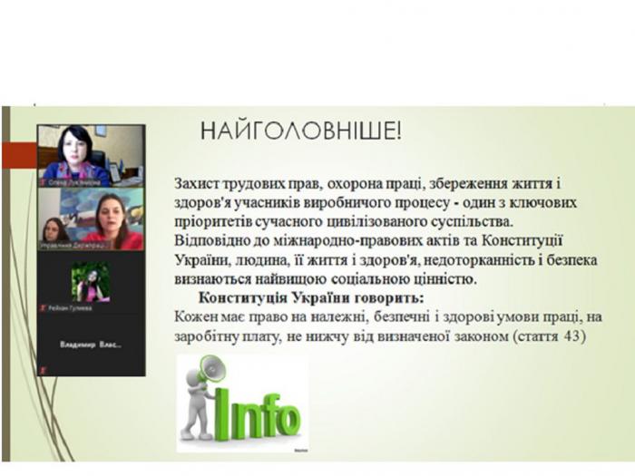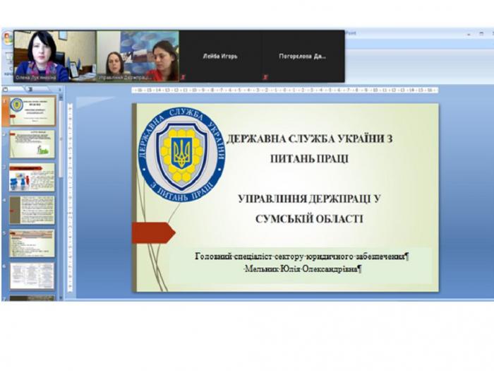 До Всесвітнього дня охорони праці, який в Україні відзначають 28 квітня як День охорони праці, для студентів 1 курсу Сумської філії ХНУВС було проведено бінарне заняття з дисципліни «Безпека життєдіяльності та охорона праці» за участі Ірини Колесник – головного державного інспектора відділу нагляду в будівництві, котлонагляді на транспорті та зв'язку Управління Держпраці у Сумській області та головного спеціаліста сектору юридичного забезпечення цього ж управління Юлії Мельник.