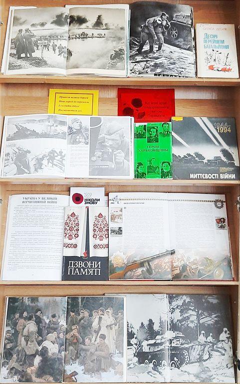 Експозиція містить понад 100 видань та фотоматеріалів про Другу світову війну, про вшанування подвигу народів, про внесок України у Перемогу антигітлерівської коаліції. Ні з чим не порівняти втрати й руйнування, які принесла ця війна. Експозиція надає можливість усвідомити й глибше зрозуміти місце та роль українського народу у Великій Перемозі над нацизмом, за яку Україна заплатила стражданнями поколінь.