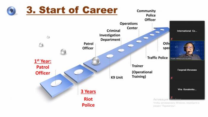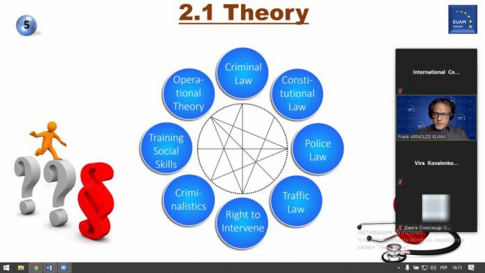 Доповідач розповів про загальні відомості своєї країни – Німеччини, висвітлив особливості підготовки майбутніх поліцейських, а саме вступу на навчання, умови навчання, наявні курси та спеціалізації підготовки. Крім того, спікер ознайомив учасників із початком роботи поліцейського в Німеччині та з можливостями подальшого кар’єрного зростання.