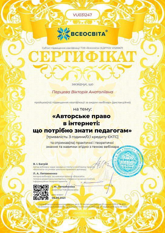 Доцентка Вікторія Перцева пройшла курс підвищення кваліфікації «Авторське право в інтернеті: що потрібно знати педагогам», під час якого отримала практичні й теоретичні знання та навички, які будуть використані для формування позитивного іміджу закладу вищої освіти.
