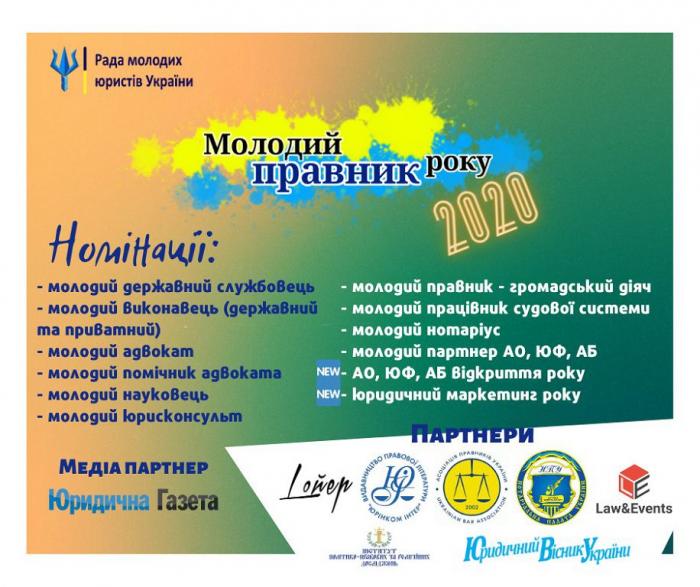 Всеукраїнський конкурс «Молодий Правник року» проводиться Координаційною радою молодих юристів України за підсумками пройдешнього року у номінаціях: молодий державний службовець; молодий виконавець (державний та приватний); молодий адвокат; молодий помічник адвоката; молодий науковець; молодий юрисконсульт; молодий правник – громадський діяч; молодий працівник судової системи; молодий нотаріус; молодий партнер; відкриття року; юридичний маркетинг року.