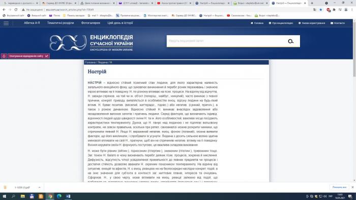 Вийшов друком 22-й том «Енциклопедії Сучасної України» (The Encyclopedia of Modern Ukraine), яка висвітлює Україну й українців ХХ–ХХІ століття, пропагуючи досягнення академічної науки й сприяючи поширенню наукових знань у суспільстві. Завідувачка відділення організації підготовки іноземних громадян факультету № 6 кандидат філологічних наук, доцент Тамара Цапко підготувала для енциклопедії статтю «Настрій».