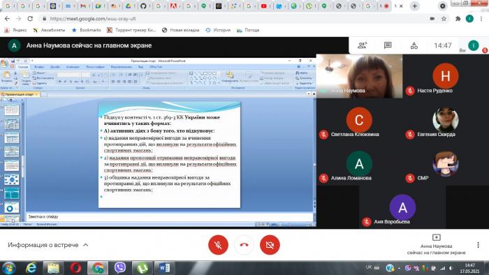 Доценткой кафедри кримінального права та кримінології факультету № 6 Харківського національного університету внутрішніх справ Анною Наумовою для студентів факультету проведено відкриту лекцію з використанням мультемідійних технологій на тему «Кваліфікація протиправного впливу на результати офіційних спортивних змагань» з дисципліни «Кваліфікація злочинів у сфері службової діяльності».