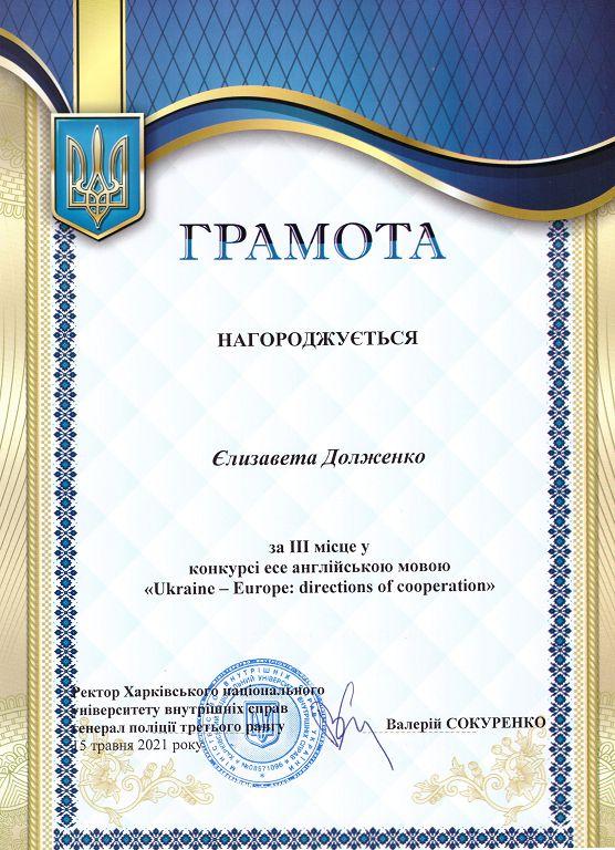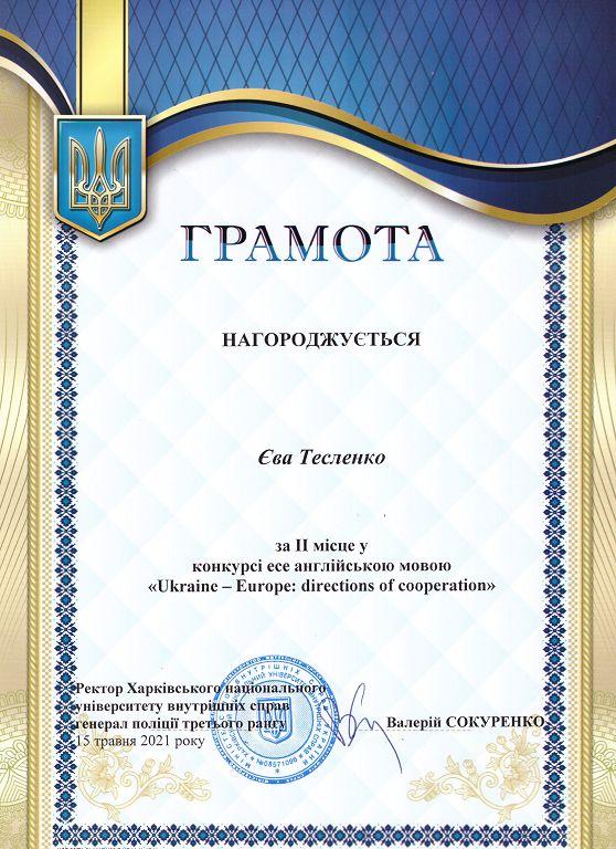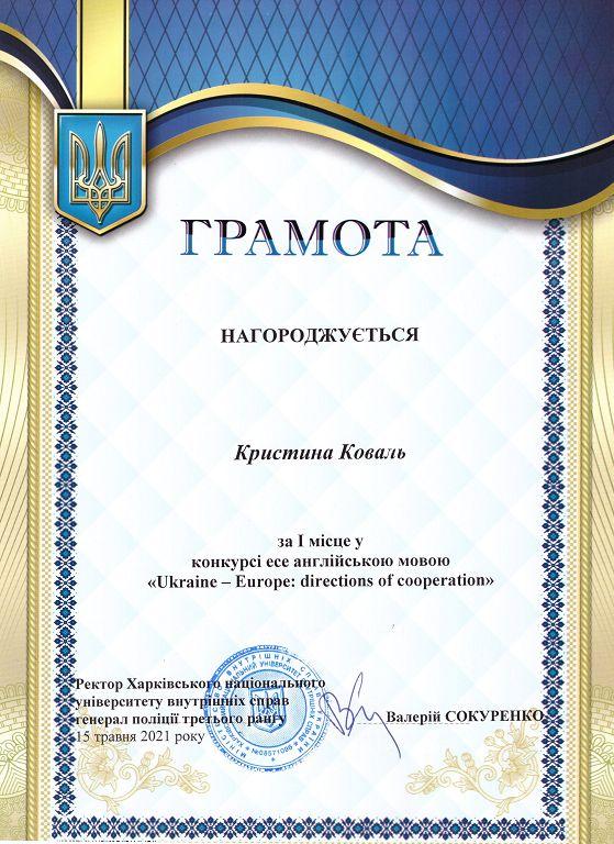 Підбито підсумки конкурсу есе англійською мовою «Ukraine – Europe: directions of cooperation» до Дня Європи в Україні, який був організований відділом міжнародного співробітництва та кафедрою іноземних мов факультету № 1 ХНУВС у межах Всеукраїнської інформаційної кампанії EUкраїна.