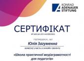 За час навчання були розглянуті питання історичного розвитку та різновидів медіа, їх вплив на суспільство, опрацьовані завдання медіаосвіти, проаналізований світовий та український досвід медіаосвіти. Особливу увагу було приділено ролі медіаграмотності у формуванні довіри до освіти, основам авторського права та спілкуванню в мережі. За успішне закінчення цього курсу Юлія Загуменна отримала сертифікат.