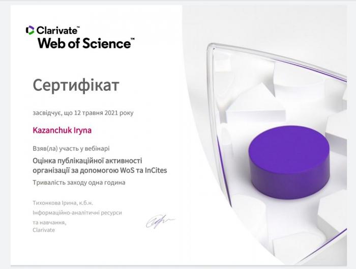 Під час вебінарів Ірина Казанчук ознайомилася з інформацією, яка стосувалася: оцінки публікаційної діяльності організації; оформлення пристатейної літератури за форматом журналу; перевірки індексації видання на платформі Web of Science; як створити і експортувати в певному форматі список публікацій організації на певні роки; які роботи (не) можуть потрапити в профіль організації; які показники можна подивитися; як знайти найбільш оптимальні організації партнери для виконання проєкту по своїй темі.