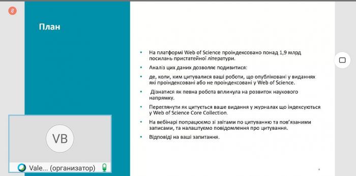 Тематика вебінарів: «Оцінка публікаційної активності організації за допомогою WoS та InCites», «Можливості нового інтерфейсу Web of Science Core Collection», «Пристатейна література: доступні скарби Web of Science».