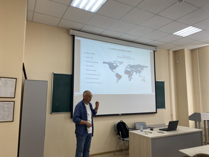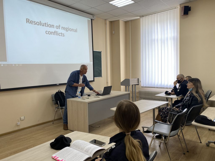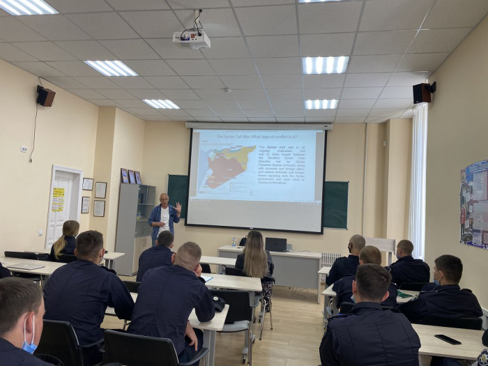 Олексій Теличкін розповів про діяльність міжнародної поліції із забезпечення прав людини у миротворчих операціях. Були також розглянуті причини виникнення регіональних конфліктів у сучасному світі. Курсанти цікавилися причинами початку війни в Сирії, хто бере участь у діях, за що воюють сторони та які шляхи вирішення конфлікту. Олексій Теличкін дав відповіді на запитання курсантів, підкресливши роль світової спільноти у збереженні миру.