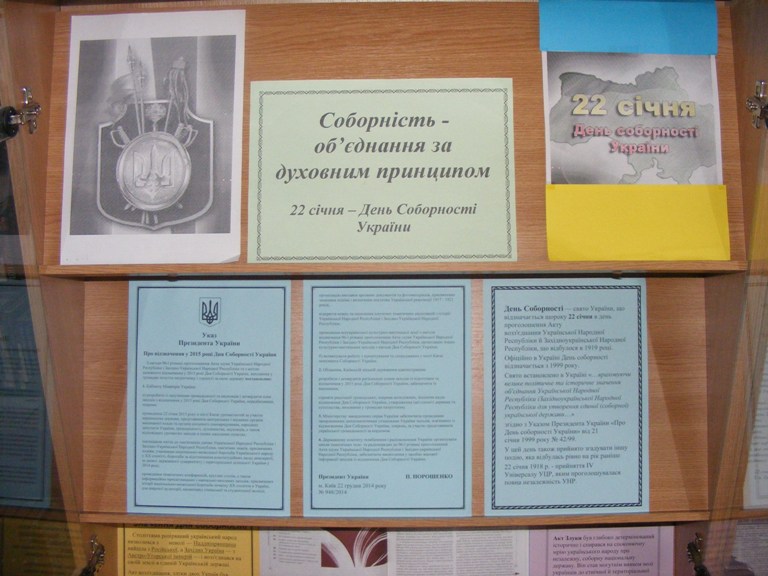 До державного свята – Дня Соборності України бібліотекою університету організована розгорнута книжково-ілюстративна експозиція, яка проведе сторінками видань від минулого країни до сьогодення.